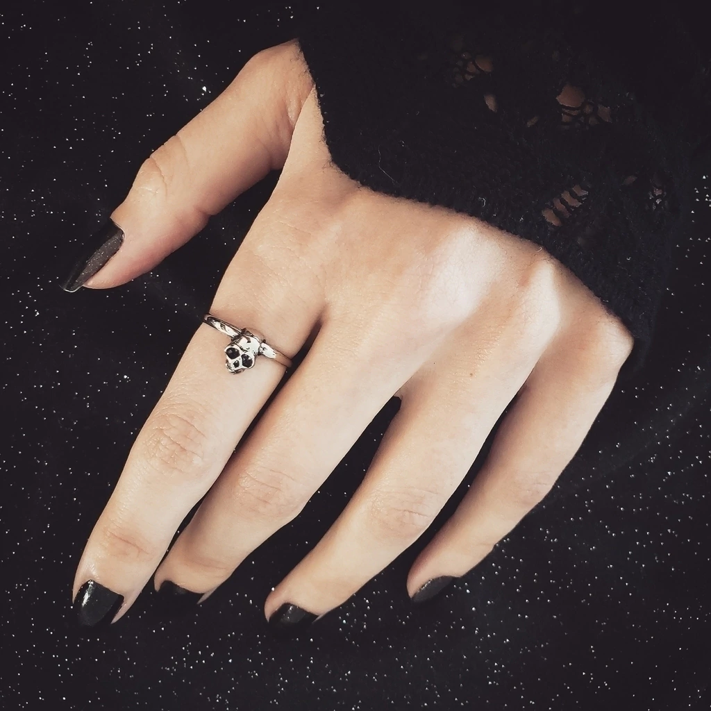 Anel com caveira centralizada tamanho 19 disponível no banho prateado envelhecido.