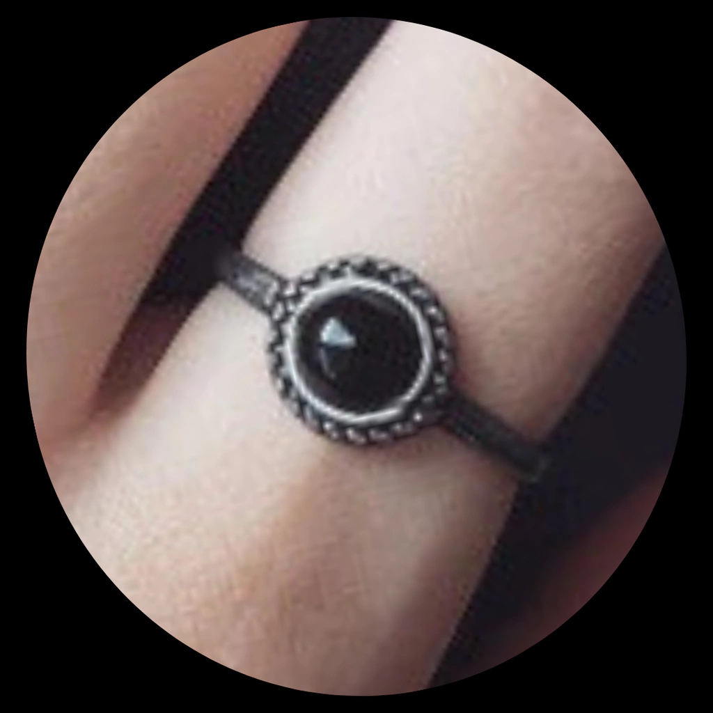Anel tamanho 19 disponível no banho grafite fosco. Detalhe em pedra acrílica preta.