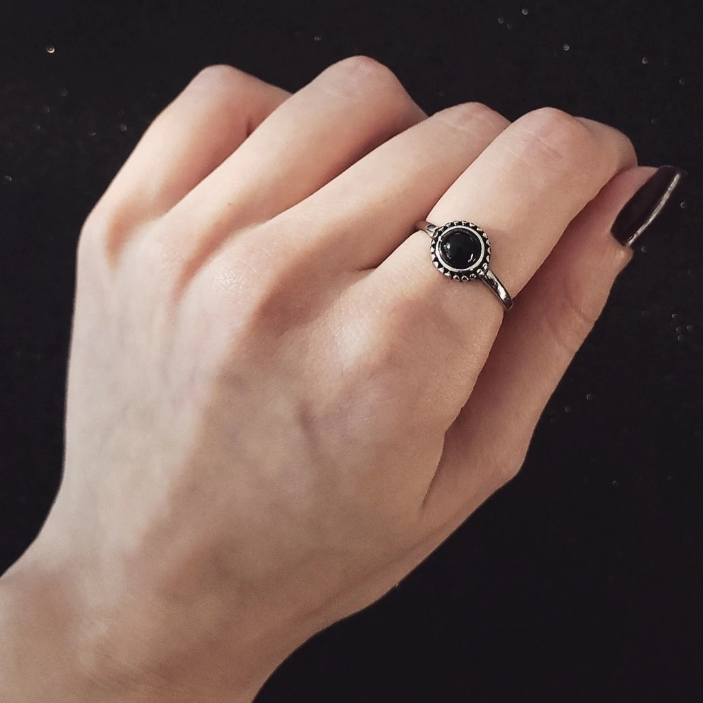 Anel tamanho 19 disponível no banho prateado envelhecido. Detalhe em pedra acrílica preta.