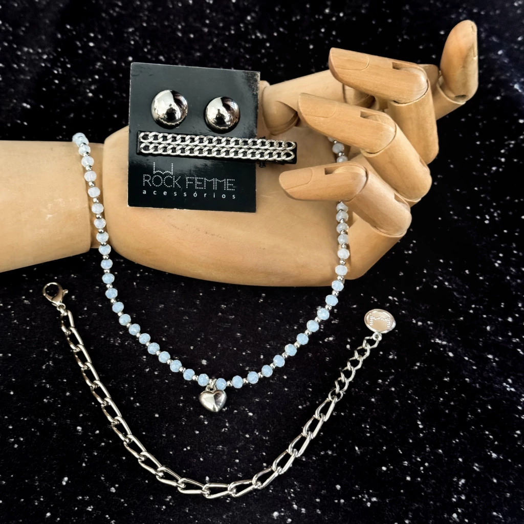 - Um grampo de cabelo modelo pico de pato com detalhe em corrente prateada.